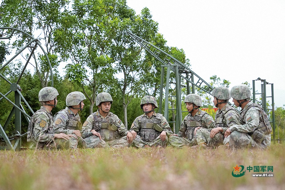 練習停止,第74團體軍某旅某連黨支部成員圍坐一路,針對練習中的缺乏與短板停止互查互糾。李 彬攝